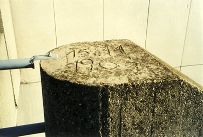vollendet hat, mit dem Finger das Datum in den erhärtenden Beton