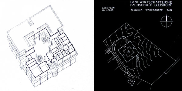 den Saal und das Obergeschoss das Internat aufnimmt. Die Anlage gliedert