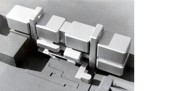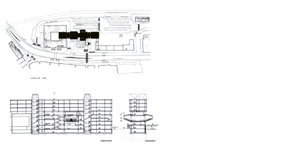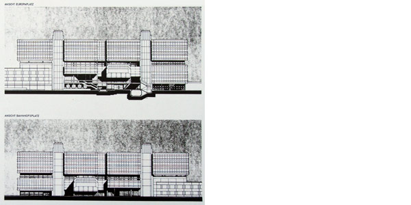 Urteilsfindung demonstrieren. Der Entwurf sieht vor, dass sich die Öffentlichkeit des Europaplatzes und des niveauverschiedenen Bahnhofsplatzes im Bereich der beiden unteren Geschosse des Gebäudes durchdringen und mit Hilfe von Brücken und Treppen die Vermittlung der beiden Niveaus hergestellt werden. Der Ratsaal stellt ein dominierendes Formelement in dem weitgehend transparenten Gebäudesockel dar. Darüber liegen an zwei formaktiven Fixpunkten als breit gelagerte Baumasse die einzelnen Verwaltungsfachbereiche. |